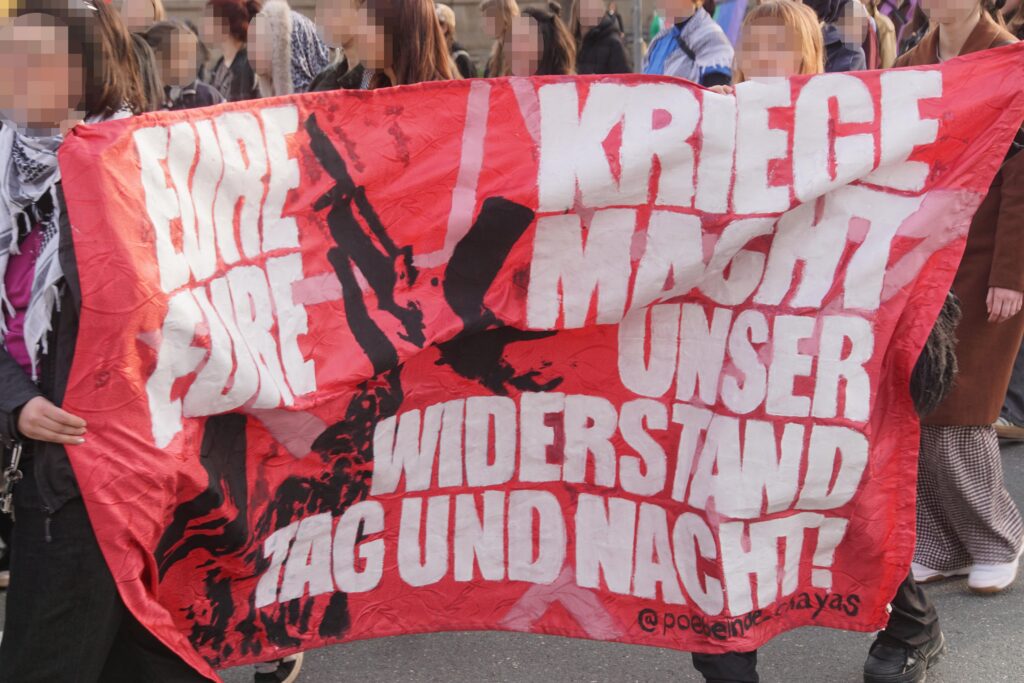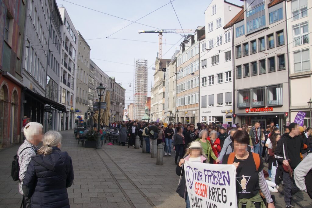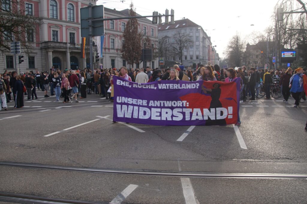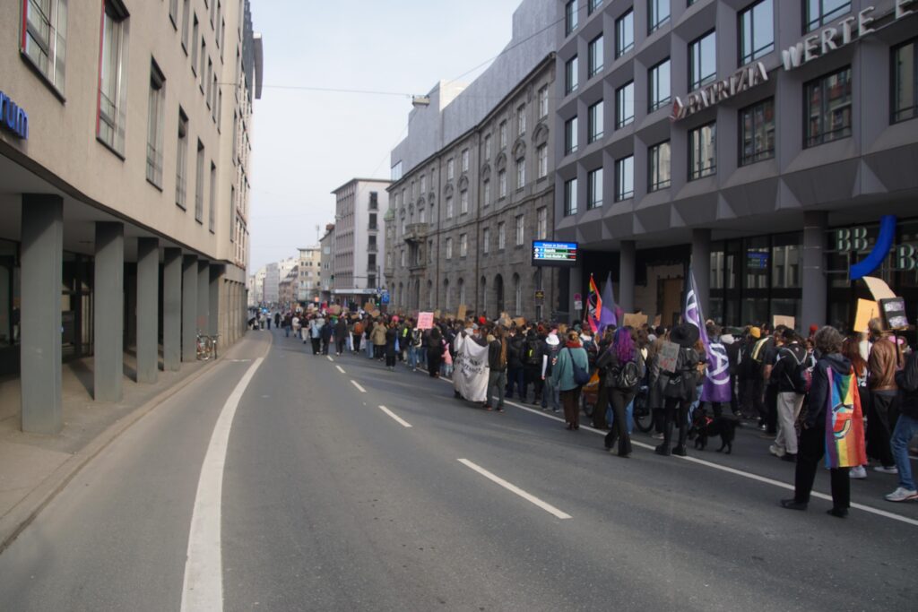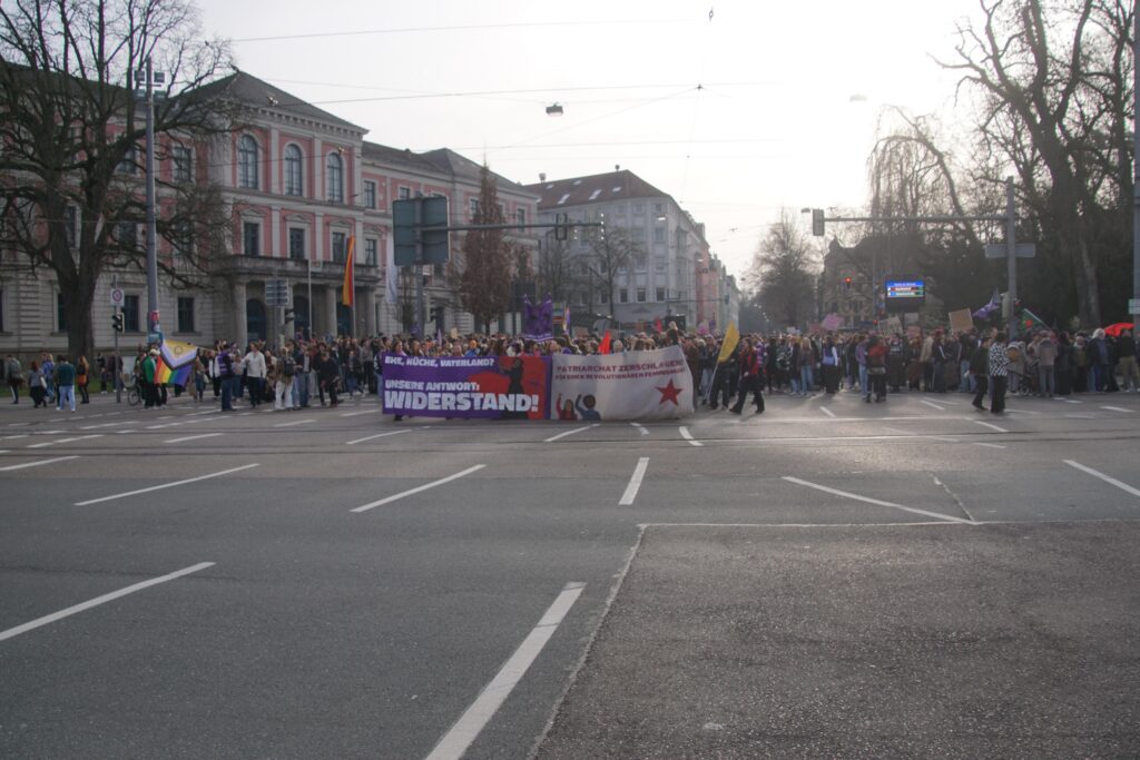 Verschiedenste Organisationen kritisierten in ihren Redebeiträgen patriarchale Gewalt in unterschiedlichen Formen: von Alltagssexismus über Femizide, Gewalt gegen geflüchtete Frauen bis hin zur systematischen Gewalt an Frauen in Kriegen weltweit. Am Königsplatz schloss sich dann spontan eine Kundgebung afghanischer Frauen gegen das Taliban-Regime für den Rest der Demo an und es wurde sich lautstark gegenseitig solidarisiert.